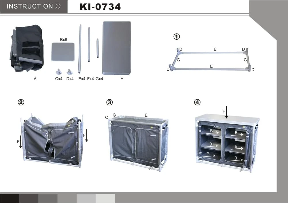 Staat de campingkeuken op een ongelijke ondergrond dan is hij makkelijk recht te zetten door middel van de verstelbare pootjes. Wanneer je de kast weer op wilt bergen kun je dit makkelijk doen met de opbergtas waar de campingkeuken in geleverd wordt.