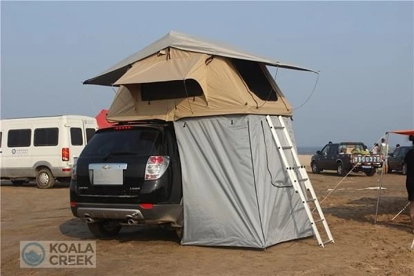 Door de speciale montage in de peesgleuven achter de ladder, past deze ondertent ook onder daktenten van veel andere merken. Belangrijk is dat de bodem afmeting uitwendig ca. 143 x 123 cm is.