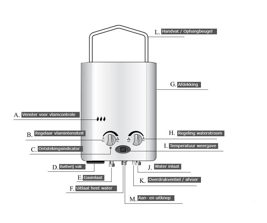 De geiser wordt geleverd met een montage set, sproeikop en pakkingen. De 2D-cel batterijen en het gas zijn niet inbegrepen. Op het gas en de batterijen na is de geiser gebruiksklaar.