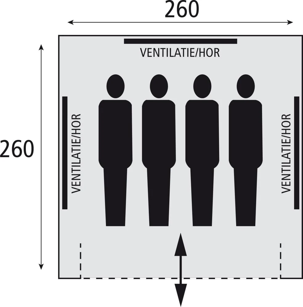 De grote voorwand is helemaal weg te rollen waardoor je snel de tent in kunt. Doordat er geen voortent aanwezig is dien je alle spullen mee te nemen in het slaapgedeelte zelf. Deze kun je aan het voeteneinde kwijt. Met 3 personen heb je uiteraard meer ruimte in de tent en kun je makkelijker de spullen stallen zonder dat dit in de weg ligt tijdens het slapen.