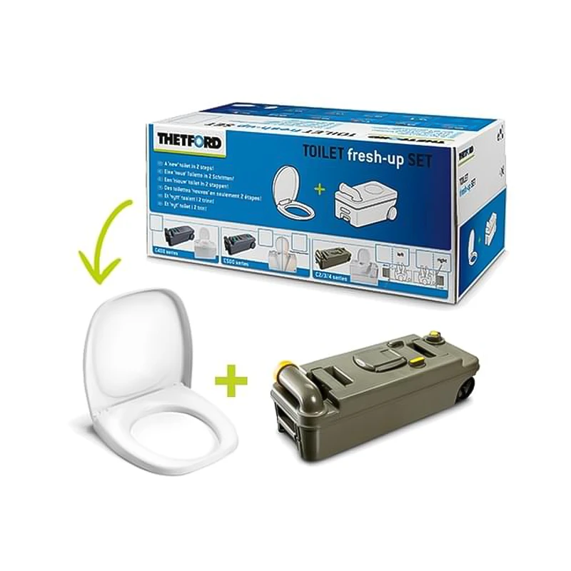 De Fresh-Up set van Thetford bied je een praktische oplossing als je cassette toilet een opfrisbeurt nodig heeft en het niet nodig is om alle onderdelen te vervangen. In deze set vind je een nieuwe afvaltank met wielen en een uittrekbaar handvat zodat hij nog gemakkelijker verplaatsbaar is. Maar ook een toiletbril met deksel zodat je alles lekker op kunt frissen.